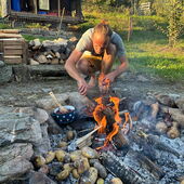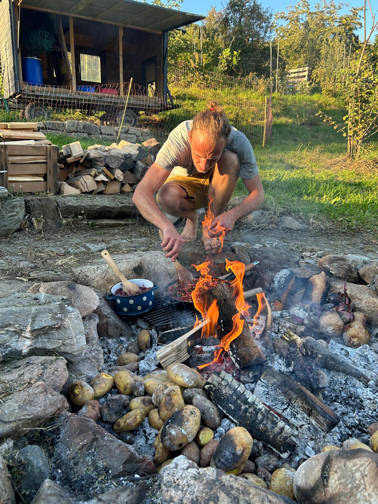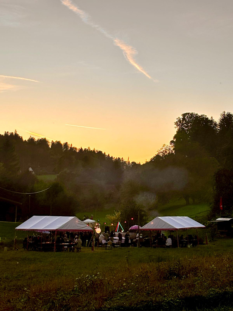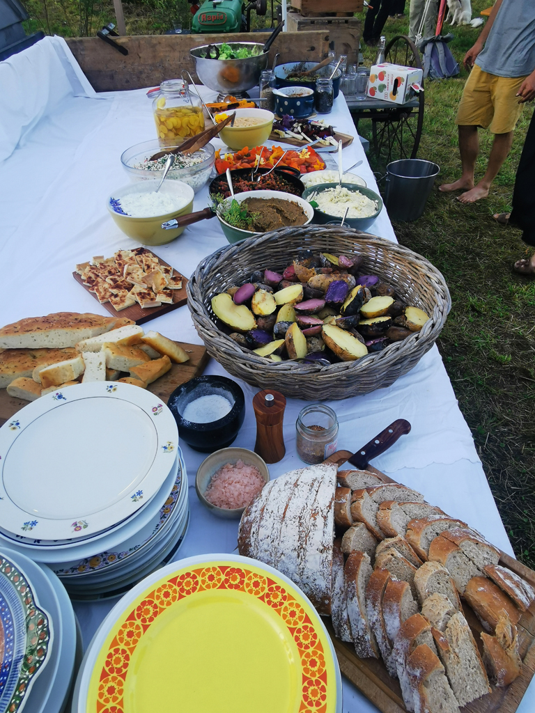 Das üppige Abendbuffet – fast alles auf dem Boden der Alten Bäckerei gewachsen und von David, Sämi, Anina und Luc am Feuer zubereitet – bot Zucchini-Baba-Ganoush, Kartoffeln und Kürbis vom Feuer, Bohnen, frische Tomaten, fermentierten Rettich, Kräutersaucen und selbstgebackenes Brot. Zum Dessert lockten Kirschentiramisu, Zwetschgenkompott, Apfelcrumble und Schokoladenmousse.