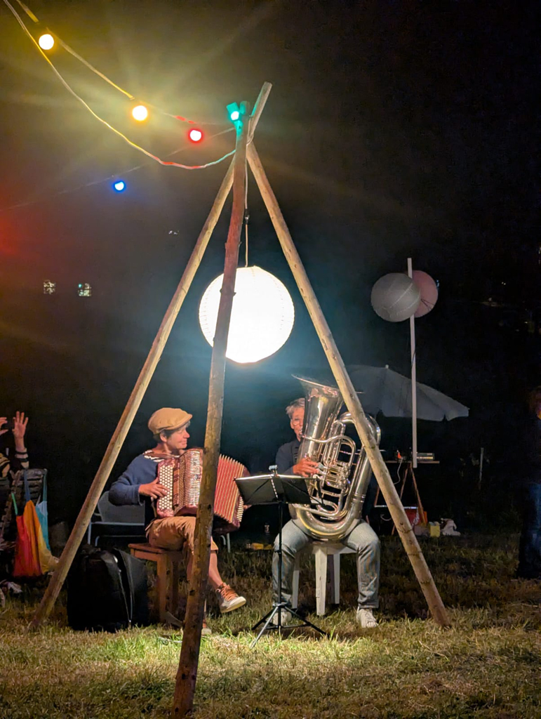 Musikalisch begleiteten die Blaskommoden den Abend. Conni Stüssi, Freundin und ehemalige Bewohnerin der Alten Bäckerei, und Judith Widmer, Freundin und Rapidpatin, tauchten den Festplatz in zweidreivierteltaktige Heiterkeit – in der es mir so war, als hätte ich kurz Charlie Chaplin und die Laufenten gemeinsam auf dem Komposthügel schnattern sehen.