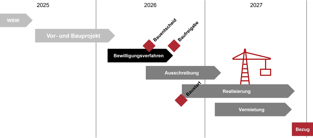 Wir erwarten, dass die ersten Bewohner:innen und Gewerbetreibenden gegen Ende 2027 das Haus beziehen.