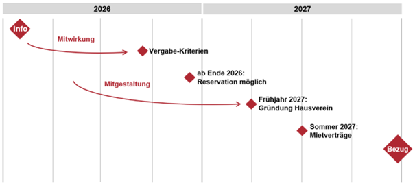 Ab Frühjahr 2026 liegt der Schwerpunkt der Begleitgruppe auf Wohnungsinteressierten. Künftig wirken damit vor allem jene an zentralen Entscheidungen mit, die später im Haus wohnen werden – auf diese Weise entsteht ein Projekt, das gut auf die zukünftige Bewohnerschaft abgestimmt ist. Schritt für Schritt entwickelt sich aus der Begleitgruppe der Hausverein, der voraussichtlich im Frühjahr 2027 gegründet wird.
